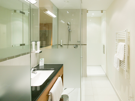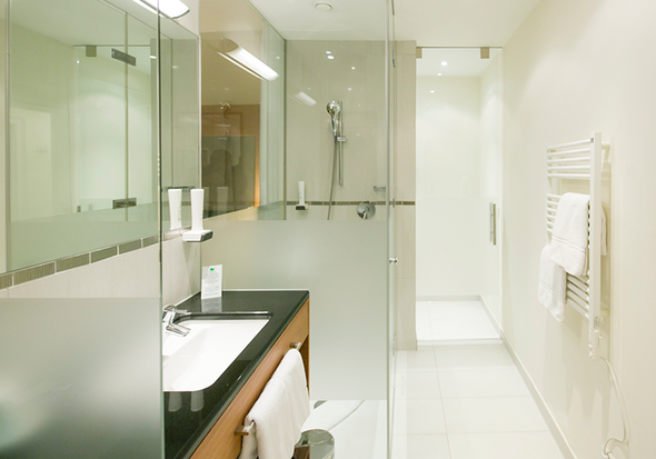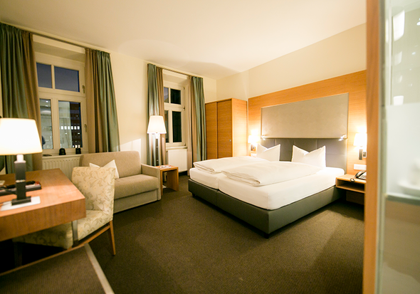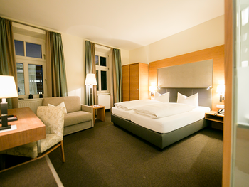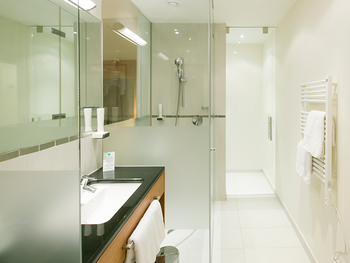 Our Business Rooms offer 23 m² of space for up to two guests and combine modern design with functional comfort. A glass wall with curtain separates the light-filled bathroom from the sleeping area, creating an open and airy atmosphere.