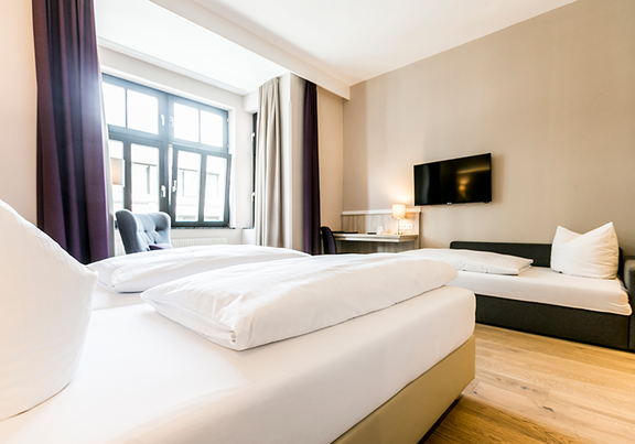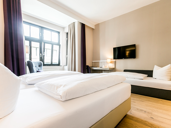 Unsere Komfort 3-Bett Zimmer sind die perfekte Wahl für Familien oder kleine Gruppen, die eine stilvolle Unterkunft in zentraler Lage suchen.